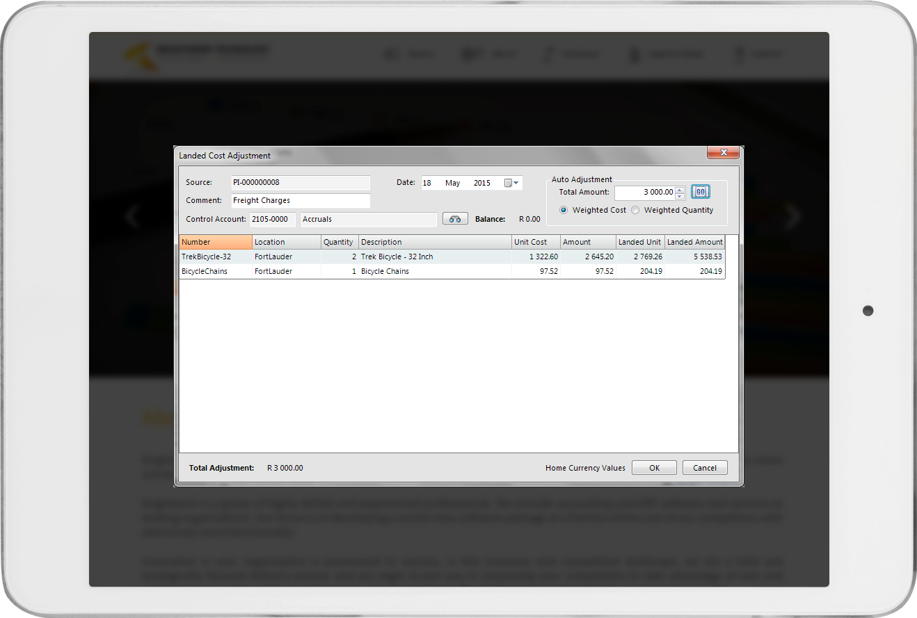 You can assign an unlimited number of additional costs to a specific goods received batch. Costs can be apportioned proportionately by the total shipment Quantity or Value, or can just be assigned manually as required. In addition the additional costs are accrued to a provision account allowing you to even assign charges with or without and Additional Cost invoice from a Vendor.