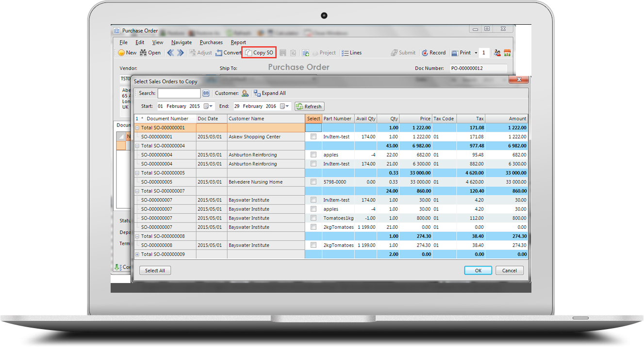 This feature allows you to create Purchase Orders by copying over the details of one or more Sales Orders to the Purchase Document. When the goods are received the system will also detail the Sales Order details at time of processing the Goods Received Voucher in order to expedite the fulfilment of the order. This is particularly useful in handling buyouts with the Sales Order details taken through to the Purchase Document catering for full traceability from Cradle to Grave.