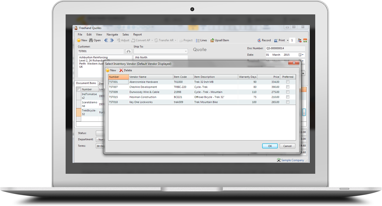 Brightwork allows you to maintain a number of Vendor Pricing per item, maintaining the Vendor's Code, Description, Price and Warranty. In addition you can use these intelligently when selecting a Vendor on creating a Purchase Document on the Fly using the Freehand Quotes function found in the Accounts Receivable section.