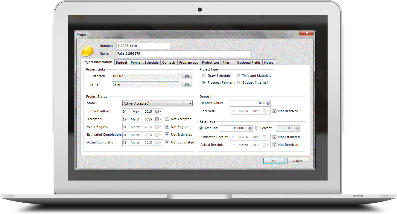 Project data can be captured, Insurance – insured value, policy number, description, expiry date, note Guarantees – guarantor name, contact number, email, value, expiry date, note Other – allow client to add user defined fields as required to add additional details as required.