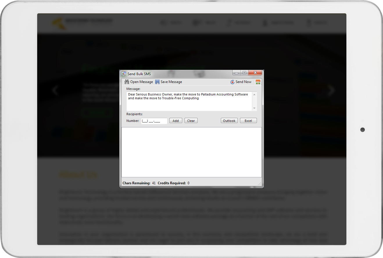 The SMS features in Brightwork allow you to send SMS messages to your clients or lists of Potential clients from Excel or Outlook. Filter using our user-defined fields to send specific messages to a focused group of clients. In addition the system caters for customer responses so you can follow up from an informed point of view. Statements and notification of overdue accounts can also be sent to customers. This function can also be used to alert users on overdue tasks or advise clients on the processing of Sales Documents. This functionality can also be installed as an independent module.